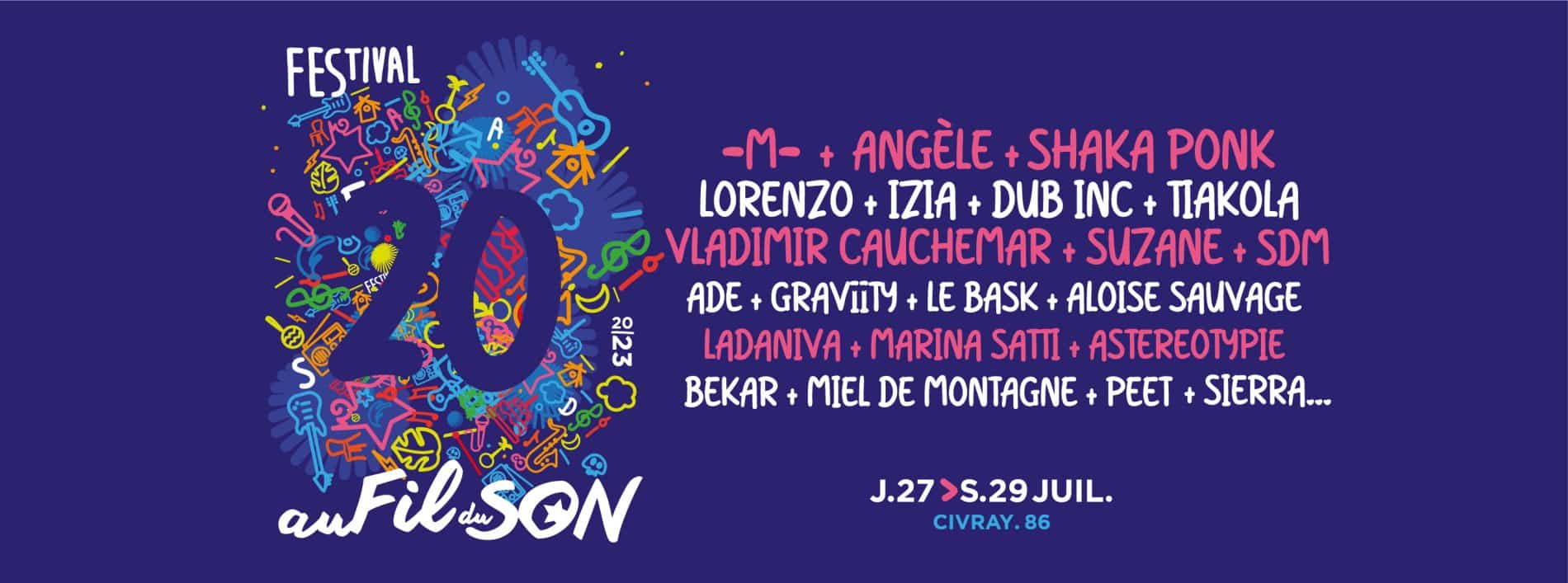 Pour son 20e anniversaire, le festival Au Fil du son prévoit un évènement explosif ! La programmation 2023 s’invite au cœur de Civray, dans la Vienne, au milieu d’un parc bucolique au bord de la Charente. Cette année, se donnent rendez-vous au pieds de l’eau, des artistes aux styles éclectiques comme le combo chant et trompette de Ladavina, le groove de l’auteur, compositeur et interprète M ou encore l’explosivité du groupe de rock Shaka Ponk, qui tient sa dernière tournée cette année. Pour la partie “OFF”, la fête n’est pas finie ! Une multitude d’activités et une programmation d’artistes locaux garantissent trois jours forts en émotions. Une 20e édition qui promet d’être champêtre et électrique !