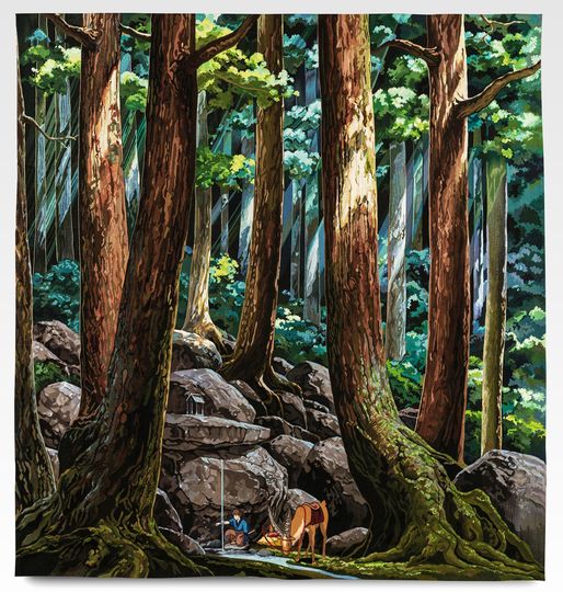 La toute première d’entre elles tirée de Princesse Mononoké, Ashitaka soulageant sa blessure sa maléfique, a débuté sa tournée française. Avoir été présentée au printemps dans le hall du Grand-Théâtre de Bordeaux, la voici au Musée du quai Branly à Paris. Faite d’ombres et de lumières, d’écorces, de rochers, de feuillages touffus transpercés par les rayons du soleil, cette image dit bien l’importance chez le grand réalisateur japonais de la nature, et singulièrement de la forêt. Une forêt traversée par la magie, peuplée d’esprits, parfois menaçante, souvent havre de paix.